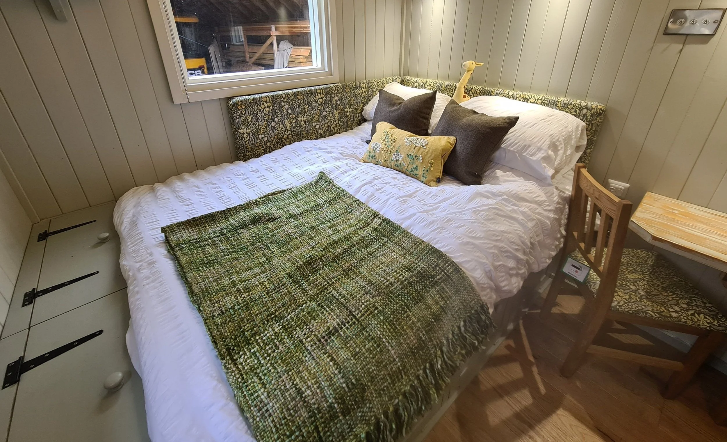 Enjoy a raised double bed designed for comfort and charm, featuring an eco-friendly memory foam mattress that supports restful, year-round sleep. Thoughtfully integrated underbed storage offers practical space-saving solutions, while the upholstered headboard surround adds a soft, inviting finish. At the foot of the bed sits a handcrafted wooden footlocker, perfect for storing blankets or personal items. The look is completed with a full bedding set and scatter cushions, bringing warmth & texture to your retreat. This layout maximises functionality without compromising on style — ideal for glamping accommodation!