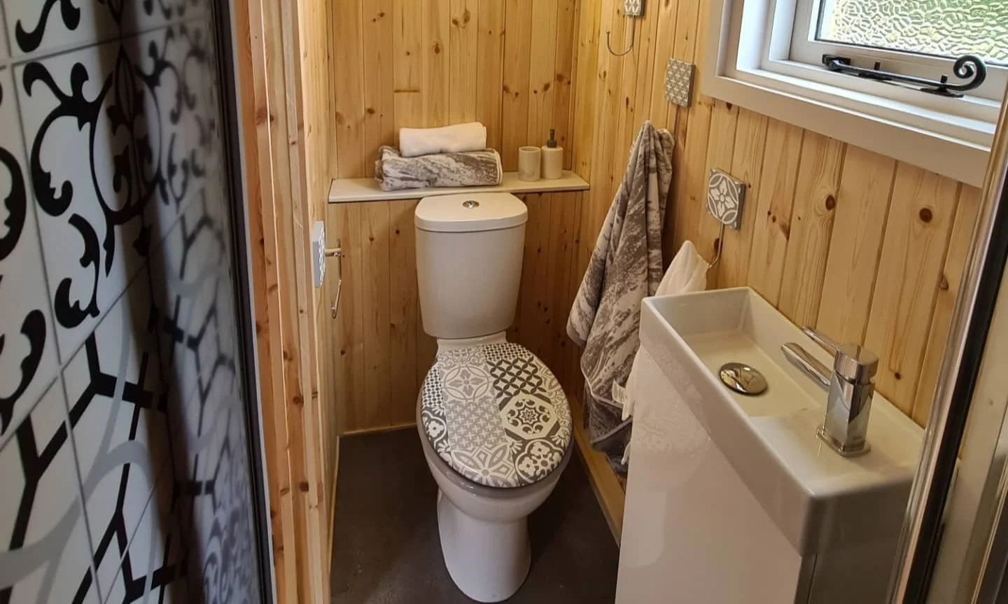 Enjoy the comfort and convenience of a self-contained bathroom, separated by a partition wall to create a private space within your hut. This thoughtfully designed area includes a plumbed-in toilet, hand basin, and a powerful 8.5kW electric shower, making it ideal for glamping pods, holiday lets, or year-round retreats. The shower is housed in a custom-built enclosure with a shower tray, bifold glass door, and your choice of wet wall finish—blending practicality with personalised style. Built for comfort, privacy, and long-lasting use in all seasons.